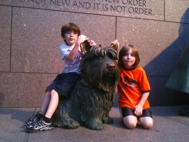 The boys with Fala at the FDR Memorial (Day 5: Trek around the west end of the mall and Tidal Basin).
