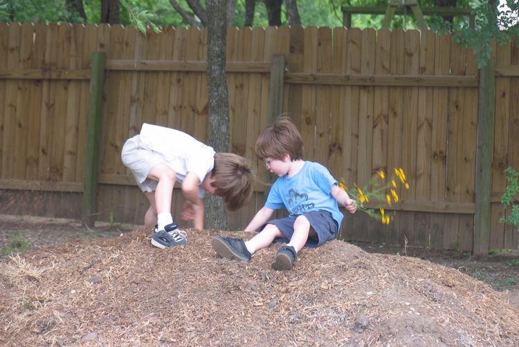 We walked to a nearby park; no playscape, but a big pile of mulch